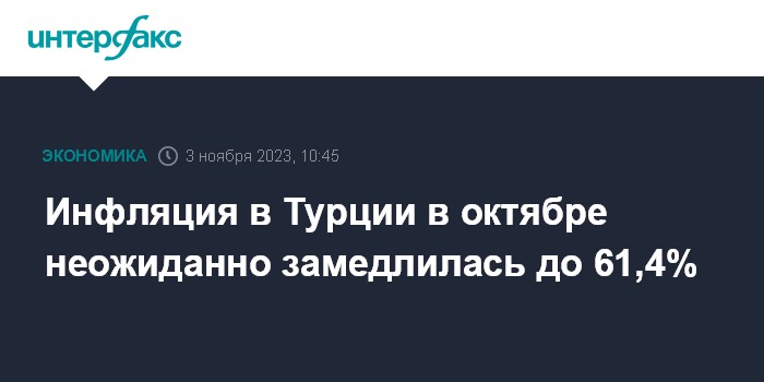 Москва. 3 ноября. INTERFAX.RU - Инфляция в Турции в октябре незначительно замедлилась впервые за четыре месяца и оказалась чуть ниже ожиданий рынка.