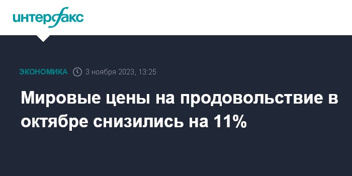 Москва. 3 ноября. INTERFAX.RU - Мировые цены на продовольствие в октябре по сравнению с аналогичным месяцем прошлого года снизились на 10,9%, по сравнению с сентябрем уменьшение составило 0,5%, сообщает ФАО (продовольственная и сельскохозяйственная организация ООН).