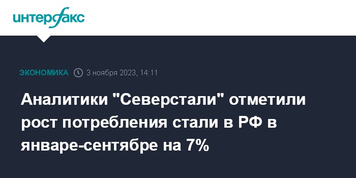 Москва. 3 ноября. INTERFAX.RU - Потребление стали в РФ выросло за 9 месяцев 2023 года на 7% до 35,1 млн тонн, говорится в обзоре, подготовленном "Северсталью". При этом эксперты компании отмечают, что, несмотря на позитивные показатели динамики спроса, макроэкономические условия начинают ухудшаться.