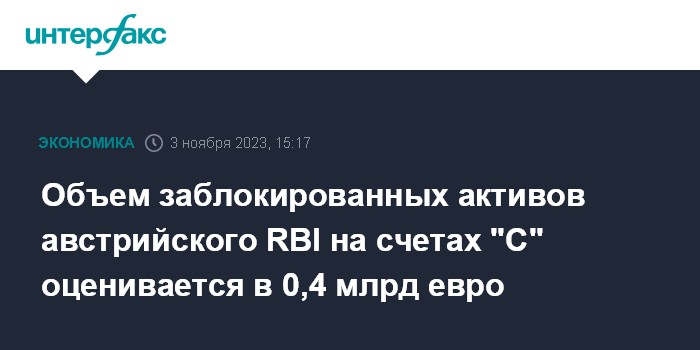 Москва. 3 ноября. INTERFAX.RU - Raiffeisen Bank International (RBI) оценил объем заблокированных активов группы на российских счетах типа "С" почти в 0,4 млрд евро.