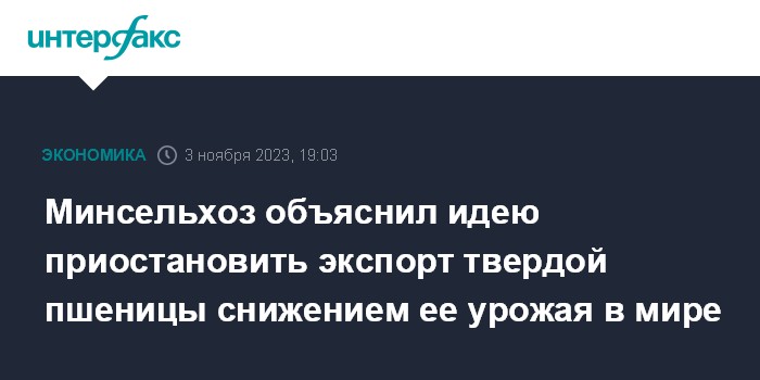 Москва. 3 ноября. INTERFAX.RU - Минсельхоз РФ, предложивший с 1 декабря 2023 года запретить экспорт твердой пшеницы на полгода, пояснил причины этого решения – снижение мирового урожая этого зерна и повышенный спрос на него в мире.