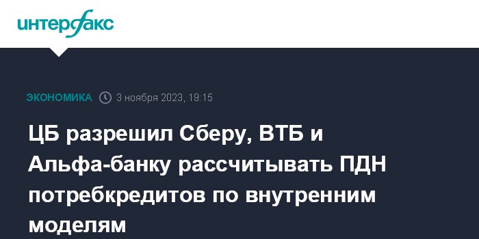 Москва. 3 ноября. INTERFAX.RU - ЦБ РФ одобрил Сбербанку, ВТБ и Альфа-банку применение собственных моделей для расчета показателя долговой нагрузки (ПДН) по потребительским кредитам, говорится в сообщении регулятора.