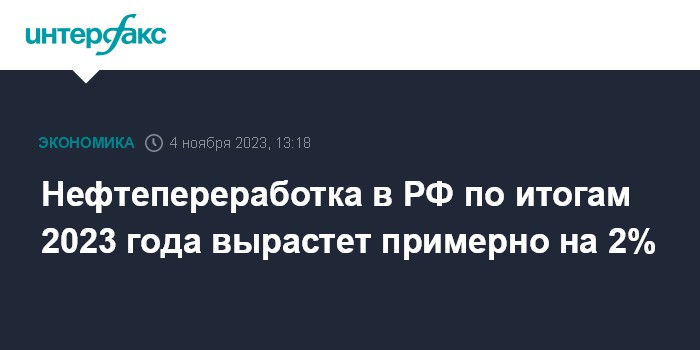 Нефтепереработка в РФ по итогам 2023 года вырастет примерно на 2%