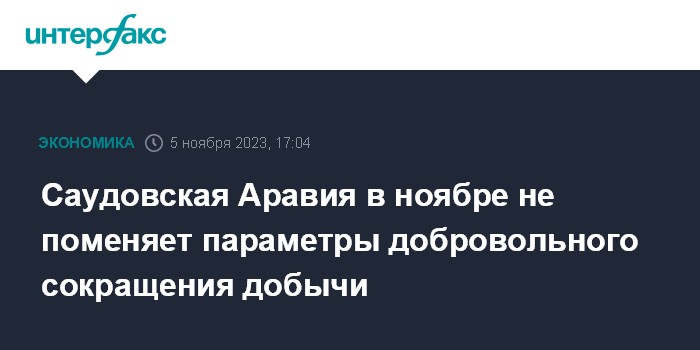 Москва. 5 ноября. INTERFAX.RU - Саудовская Аравия в ноябре не станет менять объем добровольного сокращения добычи нефти, сохранит его на уровне 1 млн б/с до конца 2023 года, говорится в сообщении государственного агентства королевства со ссылкой на официальный источник в министерстве энергетики.