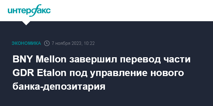 Москва. 7 ноября. INTERFAX.RU - The Bank of New York Mellon (BNY Mellon), оператор глобальных депозитарных расписок (GDR) девелопера Etalon, завершил процедуру перевода программы GDR по правилу Reg S под управление нового банка-депозитария - RCS Issuer Services S.a.r.L, говорится в сообщении Etalon Group.