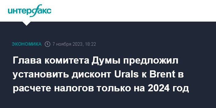 Москва. 7 ноября. INTERFAX.RU - Предложенный Минфином дисконт цены Urals к Brent в расчете нефтяных налогов необходимо установить только на 2024 год, а не на трехлетний период, заявил глава комитета Госдумы по бюджету Андрей Макаров в ходе заседания комитета во вторник. Минфин согласился обсудить это предложение.