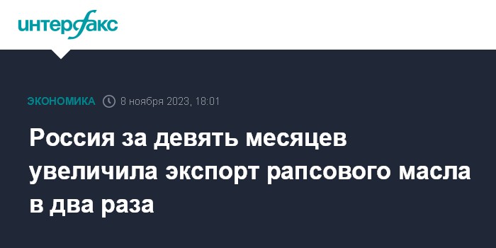 Москва. 8 ноября. INTERFAX.RU - РФ в январе-сентябре 2023 года экспортировала 1,3 млн тонн рапсового масла, что в 2,1 раза больше, чем за аналогичный период 2022 года. Экспортная выручка выросла на 40%, сообщает центр "Агроэкспорт" при Минсельхозе.