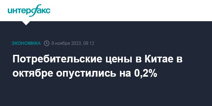 Москва. 9 ноября. INTERFAX.RU - Потребительские цены (индекс CPI) в Китае в октябре снизились на 0,2% по сравнению с тем же месяцем прошлого года, говорится в опубликованном в четверг отчете Государственного статистического управления (ГСУ).