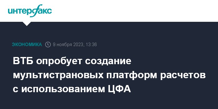 Москва. 9 ноября. INTERFAX.RU - ВТБ планирует в пилотном режиме создать платформы по проведению международных расчетов с привязкой к цифровым финансовым активам (ЦФА), заявил на форуме Finopolis зампред банка Вадим Кулик.
