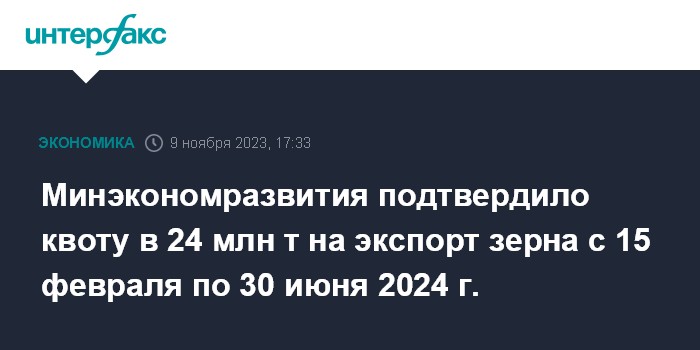 Москва. 9 ноября. INTERFAX.RU - Минэкономразвития РФ подготовило проект постановления правительства, который предусматривает размер квоты на экспорт зерна с 15 февраля по 30 июня 2024 года в 24 млн тонн.