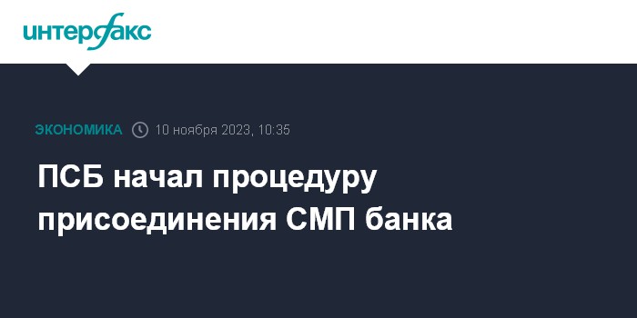 "Присоединение СМП банка к ПСБ запланировано на начало 2024 года. В настоящее время реализуются необходимые корпоративные процедуры, связанные с подготовкой к реорганизации СМП банка в форме присоединения к ПСБ", - сообщили "Интерфаксу" в пресс-службе Промсвязьбанка.