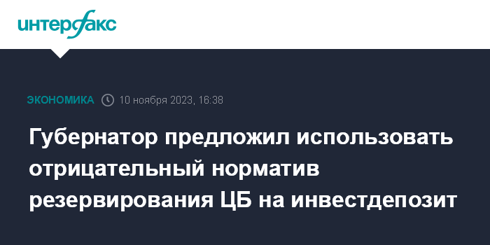 "Новое, скажем так, даже смелое предложение - использовать отрицательный норматив резервирования со стороны ЦБ на инвестиционный депозит", - сказал губернатор.