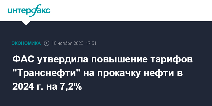 Москва. 10 ноября. INTERFAX.RU - Федеральная антимонопольная служба (ФАС) утвердила повышение с 1 января 2024 года тарифов на услуги прокачки нефти "Транснефти" в среднем на 7,2%. Это следует из соответствующего приказа, размещенного на портале правовой информации.