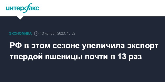 РФ в этом сезоне увеличила экспорт твердой пшеницы почти в 13 раз