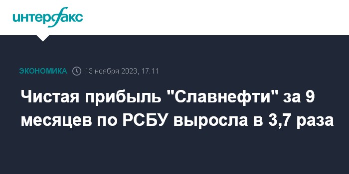 Москва. 13 ноября. INTERFAX.RU - Чистая прибыль "Славнефти" (на паритетной основе принадлежит "Роснефти" и "Газпром нефти") по РСБУ за 9 месяцев выросла в 3,7 раза, до 1,686 млрд рублей, следует из отчета компании.
