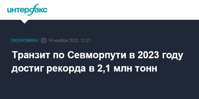 Москва. 14 ноября. INTERFAX.RU - Перевозка транзитных грузов по Северному морскому пути (СМП) в 2023 году достигла рекордных за всю историю маршрута 2,1 млн тонн, основным грузом стала нефть, рассказал "Интерфаксу" специальный представитель "Росатома" по вопросам развития Арктики Владимир Панов.