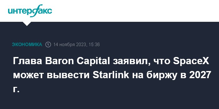 Москва. 14 ноября. INTERFAX.RU - Американская аэрокосмическая SpaceX может в 2027 году вывести на биржу свое спутниковое подразделение Starlink, полагает глава инвесткомпании Baron Capital, миллиардер Рон Бэрон.