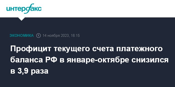 В октябре 2023 года профицит текущего счета, по предварительной оценке ЦБ РФ, составил $11,2 млрд после профицита $11,4 млрд в сентябре (эта оценка уточнена – в октябре ЦБ сообщал о профиците $9,6 млрд), профицит торгового баланса – $14,3 млрд после $15,3 млрд в сентябре (предварительно оценивался в $13,1 млрд) в результате сокращения экспорта товаров на $2,8 млрд при уменьшении импорта на $1,8 млрд.