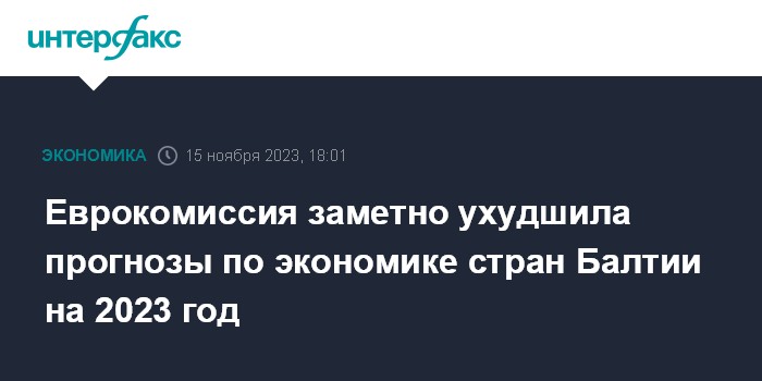 Москва. 15 ноября. INTERFAX.RU - Еврокомиссия прогнозирует по итогам 2023 года экономический спад во всех трех странах Балтии, тогда как в мае ожидала роста в Латвии и Литве и небольшой рецессии в Эстонии, говорится в осеннем обзоре ЕК.