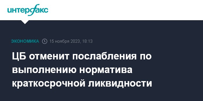 Москва. 15 ноября. INTERFAX.RU - Банк России отменяет действие послаблений по условиям соблюдения норматива краткосрочной ликвидности (НКЛ), системно значимые банки с 1 марта 2024 года будут должны поддерживать норматив на уровне 100%, сообщила пресс-служба ЦБ.