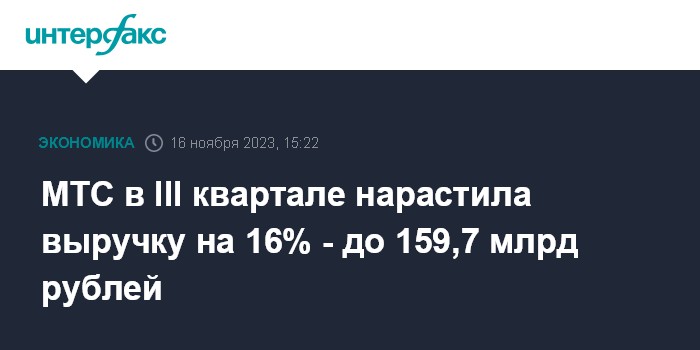 Москва. 16 ноября. INTERFAX.RU - ПАО "МТС" в III квартале 2023 года получило выручку в 159,7 млрд рублей, что на 16% превышает показатель аналогичного периода 2022 года.