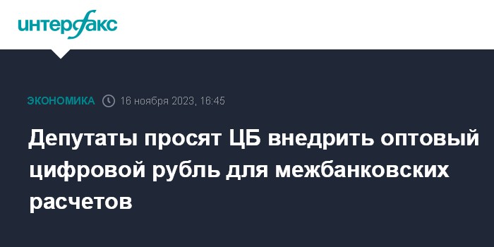 Москва. 16 ноября. INTERFAX.RU - Депутаты предложили ЦБ вернуться к рассмотрению вопроса о внедрении оптовой модели цифрового рубля, предназначенной для межбанковских платежей, эта модель рассматривалась регулятором в консультационном докладе (модель А), но в апреле 2021 года от нее было решено отказаться и отдать предпочтение розничной модели.