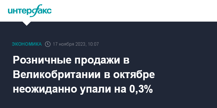 Москва. 17 ноября. INTERFAX.RU - Розничные продажи в Великобритании в октябре снизились на 0,3% по сравнению с предыдущим месяцем, говорится в отчете Национального статистического управления (ONS).