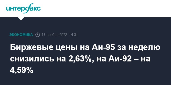 Биржевые цены на Аи-95 за неделю снизились на 2,63%, на Аи-92 – на 4,59%