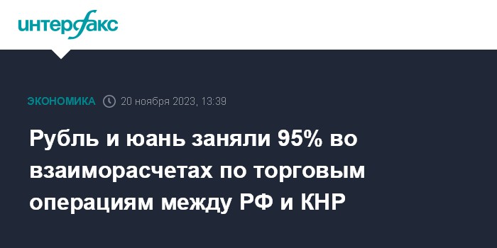 Москва. 20 ноября. INTERFAX.RU - Взаиморасчеты в национальных валютах в торговле между Россией и Китаем постоянно растут, на рубль и юань уже приходится 95% всех торговых операций, заявил первый вице-премьер РФ Андрей Белоусов на заседании межправительственной российско-китайской комиссии по инвестиционному сотрудничеству, проходящей в понедельник в Пекине.