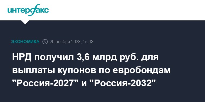 НРД получил 3,6 млрд руб. для выплаты купонов по евробондам "Россия-2027" и "Россия-2032"