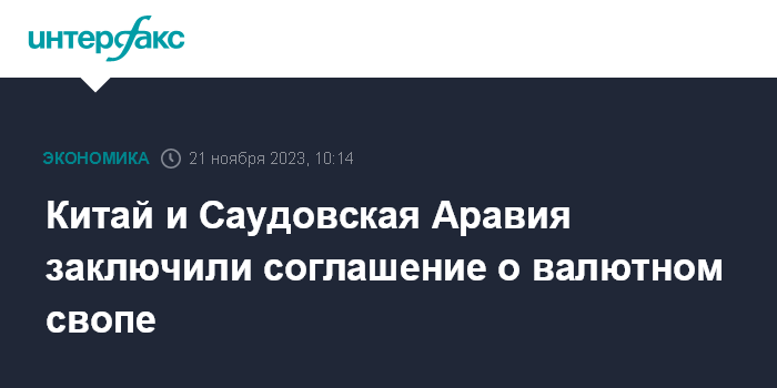 Москва. 21 ноября. INTERFAX.RU - Народный банк Китая и Центральный банк Саудовской Аравии подписали соглашение о валютном свопе, сообщает "Синьхуа".