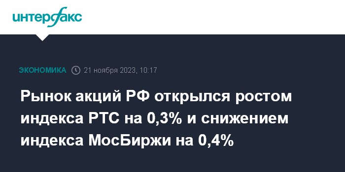 Рынок акций РФ открылся ростом индекса РТС на 0,3% и снижением индекса МосБиржи на 0,4%