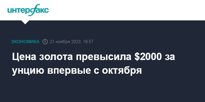 Котировки декабрьских контрактов на золото на нью-йоркской бирже Comex к 19:35 по московскому времени выросли на 1,15%, до $2003,1 за тройскую унцию. Цена превысила отметку в $2000 за унцию впервые с 31 октября, а если брать данные на закрытие торгов, сейчас золото торгуется на максимуме с 31 июля, по данным FactSet.