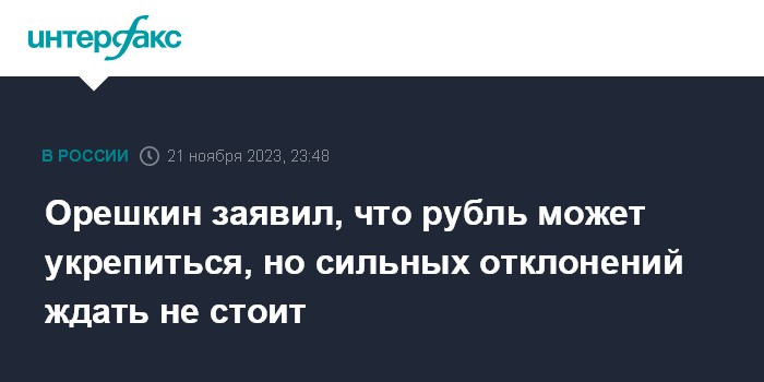Москва. 21 ноября. INTERFAX.RU - Рубль в настоящее время демонстрирует тенденцию к укреплению, которая еще может продолжиться, но кардинальных отклонений от текущих равновесных значений ожидать не стоит, считает помощник президента РФ Максим Орешкин.