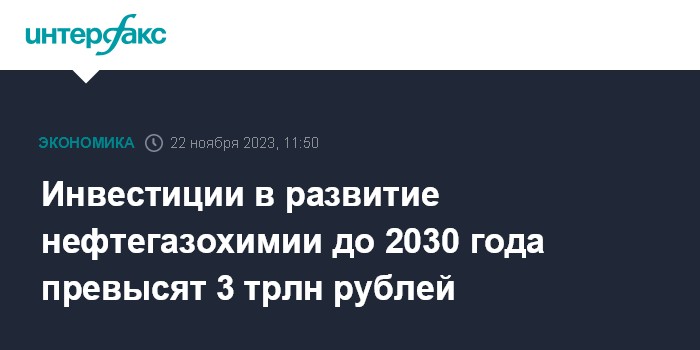 Москва. 22 ноября. INTERFAX.RU - Инвестиции в развитие нефтегазохимических производств могут составить 3-3,5 трлн рублей до 2030 года, сообщил в Совете Федерации вице-премьер Александр Новак.