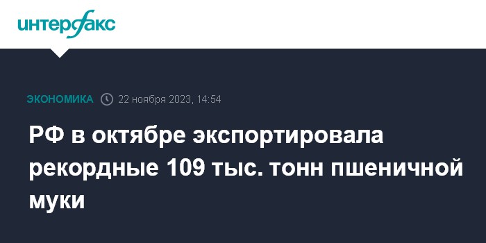 Москва. 22 ноября. INTERFAX.RU - РФ в октябре этого года экспортировала 109 тыс. тонн пшеничной муки, что стало историческим рекордом по ежемесячным поставкам. Об этом сообщила "Интерфаксу" заместитель генерального директора Института конъюнктуры аграрного рынка (ИКАР) Ирина Глазунова.