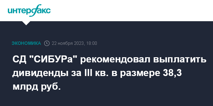 СД "СИБУРа" рекомендовал выплатить дивиденды за III кв. в размере 38,3 млрд руб.