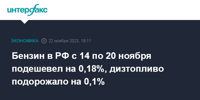 Бензин в РФ с 14 по 20 ноября подешевел на 0,18%, дизтопливо подорожало на 0,1%