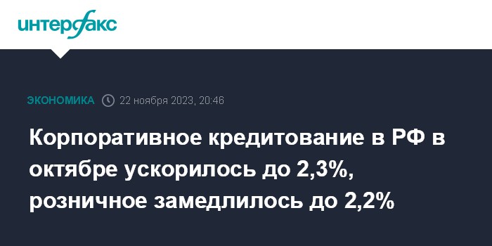 Корпоративное кредитование в РФ в октябре ускорилось до 2,3%, розничное замедлилось до 2,2%