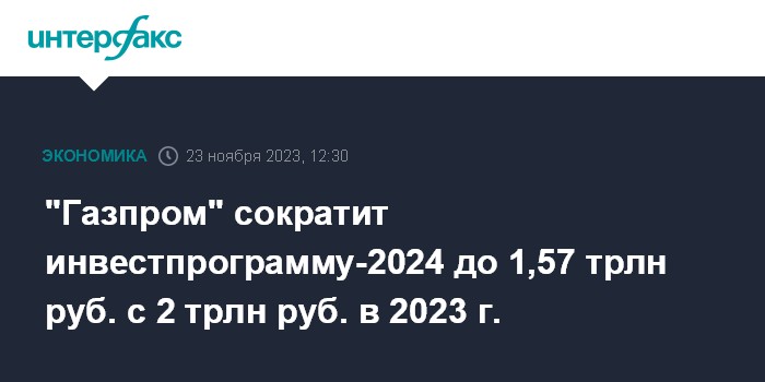 "Газпром" сократит инвестпрограмму-2024 до 1,57 трлн руб. с 2 трлн руб. в 2023 г.