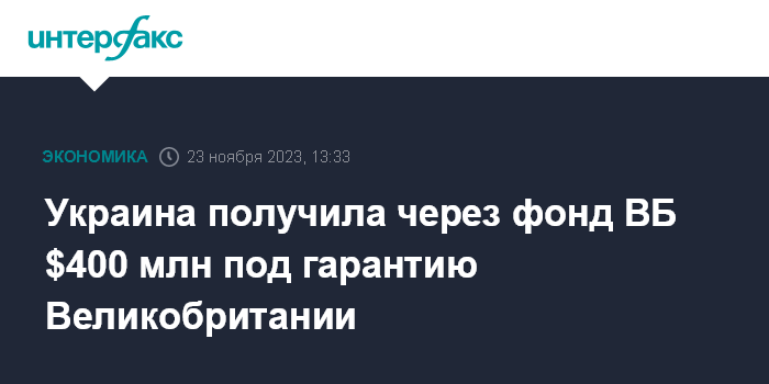 Москва. 23 ноября. INTERFAX.RU - Государственный бюджет Украины получил около $400 млн под гарантию Великобритании через трастовый фонд Всемирного банка (ВБ) по проекту поддержки госрасходов для обеспечения устойчивого государственного управления, сообщило Министерство финансов.