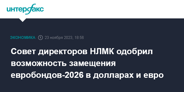 Москва. 23 ноября. INTERFAX.RU - Совет директоров "Новолипецкого металлургического комбината" (НЛМК) одобрил возможность замещения локальными облигациями двух выпусков евробондов компании с погашением в 2026 году, номинированных в долларах и евро, следует из раскрытий эмитента.