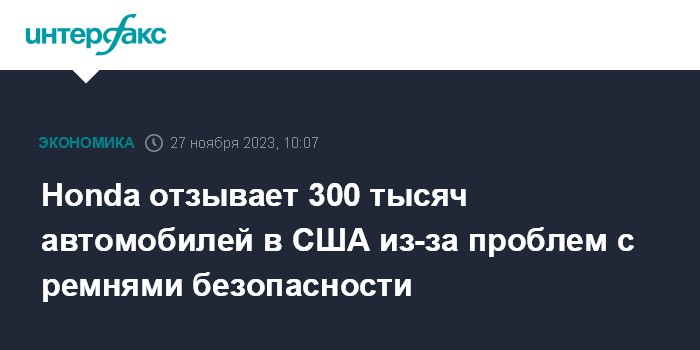 Москва. 27 ноября. INTERFAX.RU - Японский автопроизводитель Honda Motor Co. отзывает более 300 тысяч автомобилей в США из-за отсутствия детали в преднатяжителях передних ремней безопасности, что может увеличить риск травм во время аварии, сообщает MarketWatch.