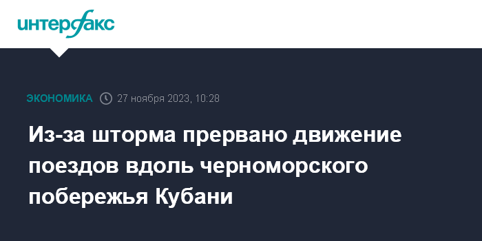 Москва. 27 ноября. INTERFAX.RU - В Краснодарском крае из-за непогоды остановилось движение поездов вдоль черноморского побережья, сообщил телеграм-канал РЖД.