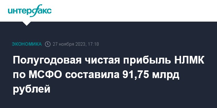 Москва. 27 ноября. INTERFAX.RU - В I полугодии 2023 года чистая прибыль ПАО "НЛМК" по МСФО составила 91,75 млрд рублей, следует из отчета компании.