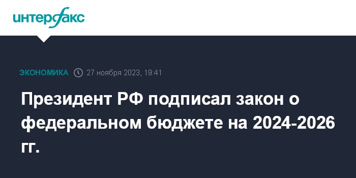Москва. 27 ноября. INTERFAX.RU - Президент РФ подписал закон о федеральном бюджете на 2024 г. и на плановый период 2025 и 2026 гг., сообщается на официальном сайте президента.