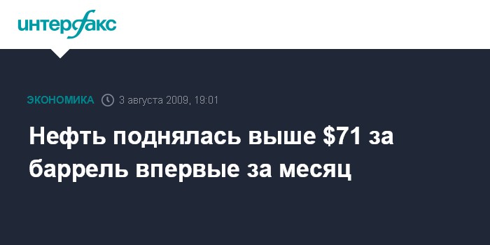 Москва. 3 августа. INTERFAX.RU - Цена нефти поднялась в понедельник выше $71 за баррель впервые за месяц, сообщило агентство Bloomberg. Цена сентябрьских фьючерсов на WTI выросла в ходе торгов на Нью-йоркской товарной бирже в понедельник на $2,24 (3,23%)- до $71,69 за баррель. В ходе торгов стоимость контрактов достигала $71,95 за баррель - максимального уровня с 30 июня.