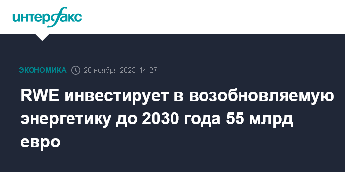 Москва. 28 ноября. INTERFAX.RU - Германская энергетическая компания RWE AG сообщила, что планирует инвестировать в технологии "зеленой" энергетики 55 млрд евро в период до 2030 года.