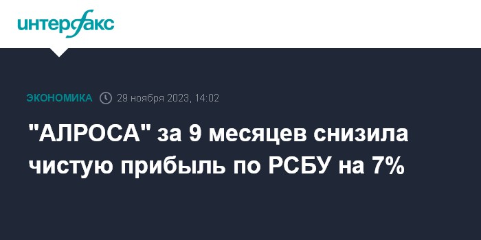 Москва. 29 ноября. INTERFAX.RU - "АЛРОСА" по результатам 9 месяцев 2023 года снизила чистую прибыль по РСБУ на 7% по сравнению с аналогичным периодом прошлого года, до 87,9 млрд рублей.