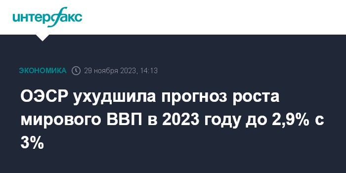 Москва. 29 ноября. INTERFAX.RU - Организация экономического сотрудничества и развития (ОЭСР) прогнозирует, что мировой ВВП в 2023 году вырастет на 2,9%. Сентябрьский прогноз предусматривал рост глобальной экономики на 3%.